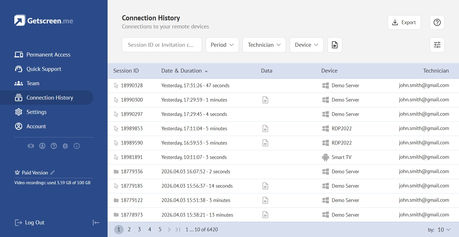 Our remote access app provides some baseline insights like connection history. It can be filtered by date, device or technicians.