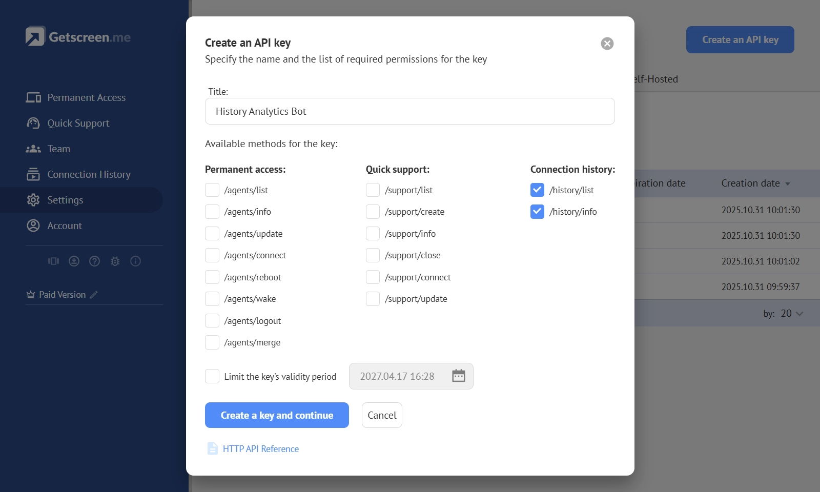 Getscreen.me exposes session data through an HTTP API. This interface provides structured access to connection history and related attributes.