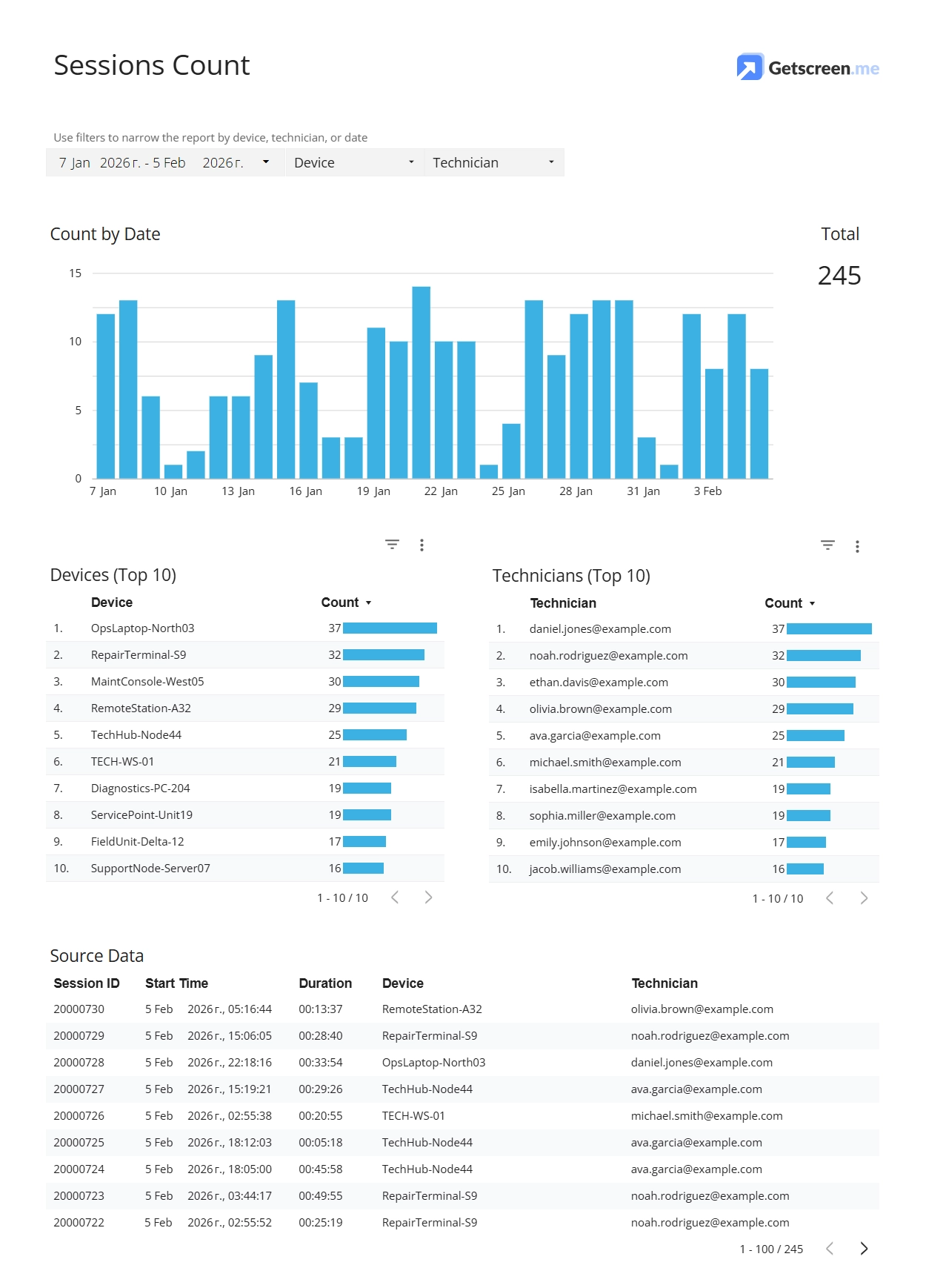 - Session timelines reveal workload distribution and peak activity periods. Device-based views show which systems require the most attention. Technician-focused metrics highlight differences in performance and workload balance.