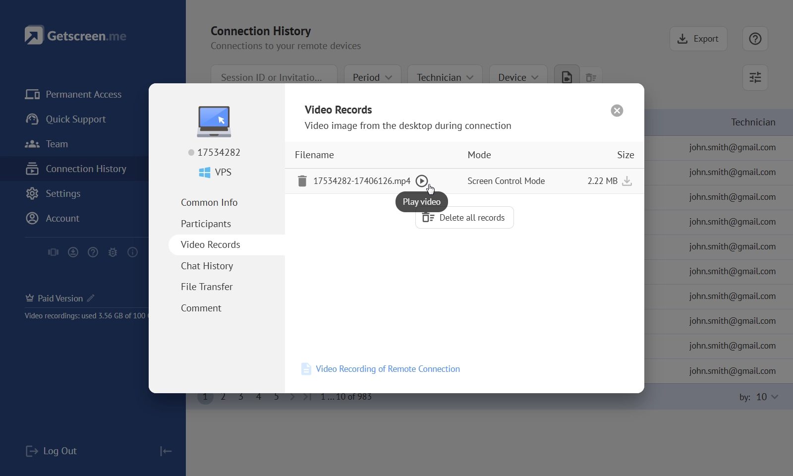 After a session ends, the recording is saved and becomes available in your Getscreen.me dashboard under Connection History. Each video is linked to the specific connection or device it belongs to, so there’s no guessing or manual labeling required.